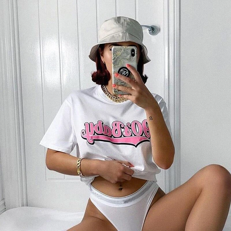 - Made of comfortable soft quality cotton blend fabric, with a quality screen print in bright pink 90s font, this top is the perfect addition/base to any outfit!