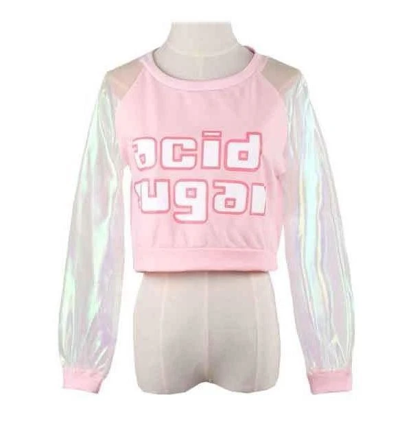 - This holographic crop top sweater has subtle rainbow reflective long sleeves, kawaii writing that says “acid sugar”, and a flattering loosely cropped fit that looks good on almost any body shape!
