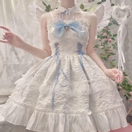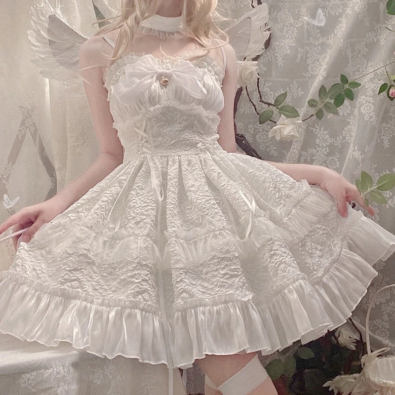 - With a lace-up front and silk chiffon ruffles & bows at the neckline, this angelic dress is perfect for bridal showers, hot summer days, or wanting to feel elegant and youthful.