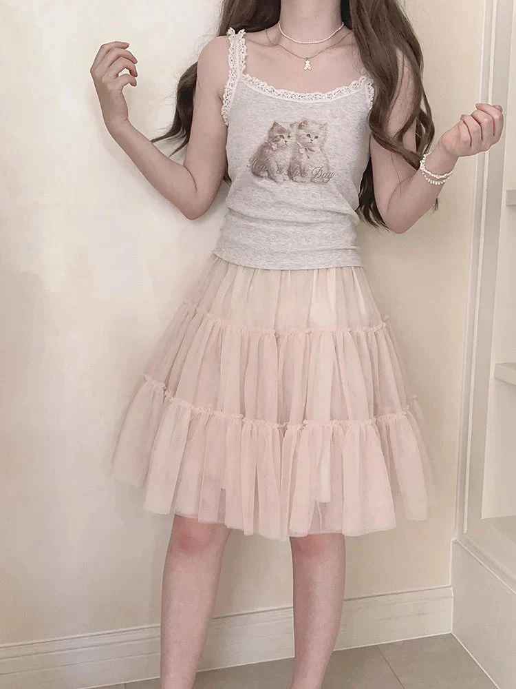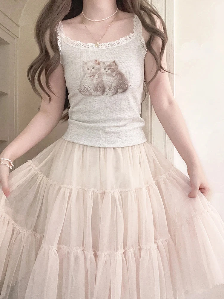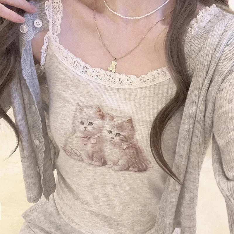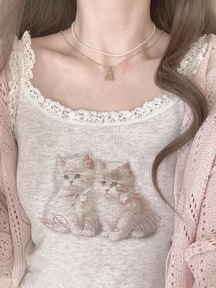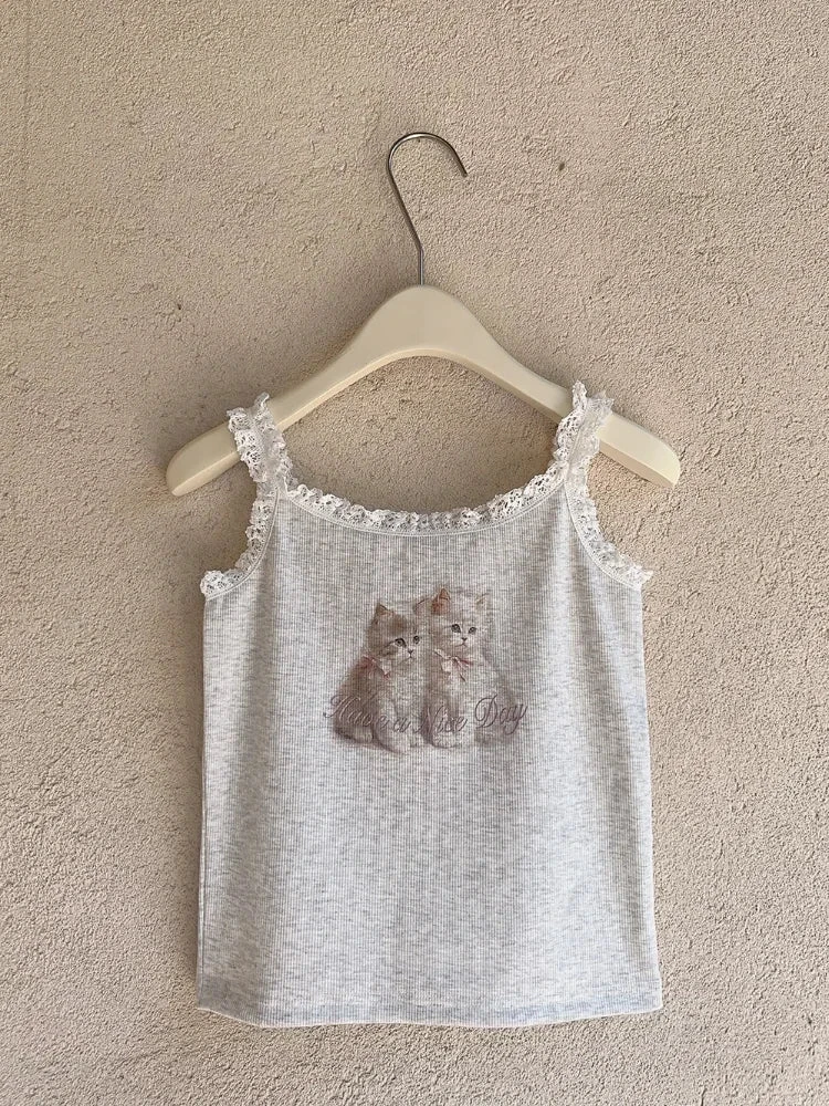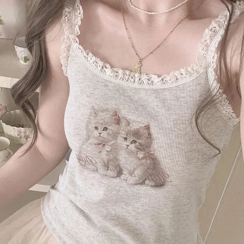 - Design Details: Adorned with a delicate lace trim, this dollette-inspired tank features a charming print of two angelic kittens, capturing the essence of nymphette aesthetics.