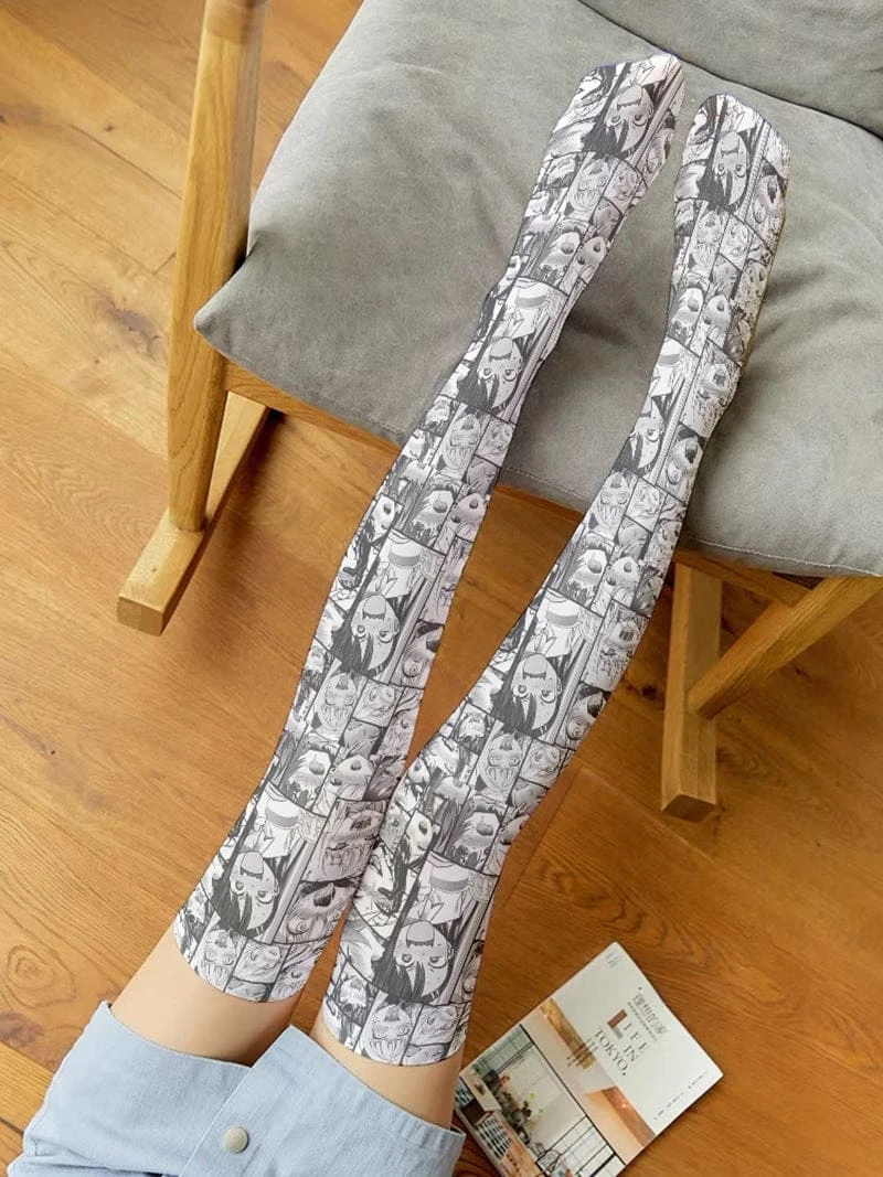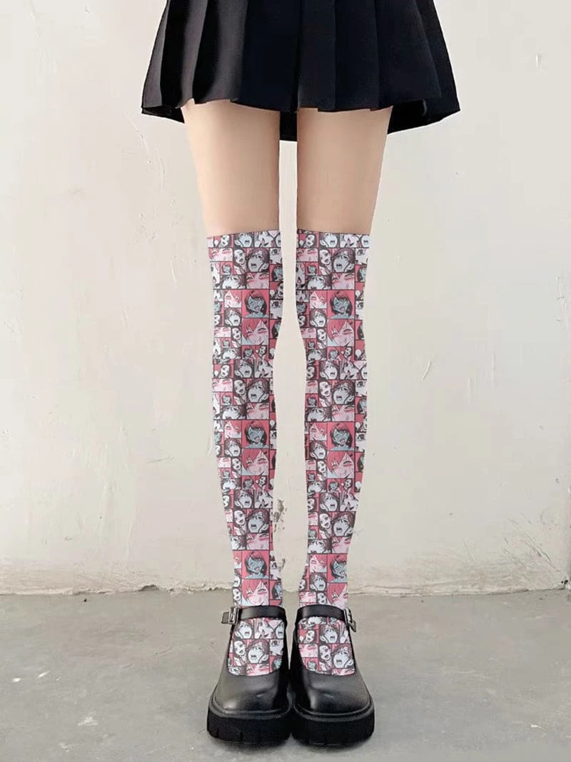 - This thigh high socks feature a comic book style strip of kawaii anime faces.
