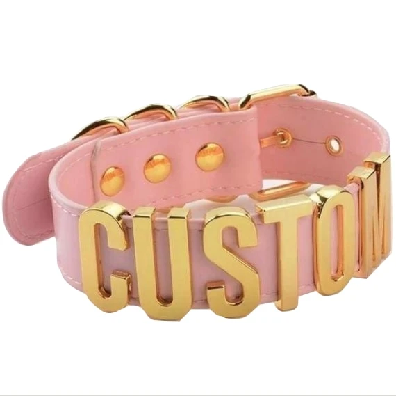 -  This gorgeous vegan leather fully customizable choker necklace has quality shiny gold hardware, belted buckle, and can say literally ANY statement you want!Â