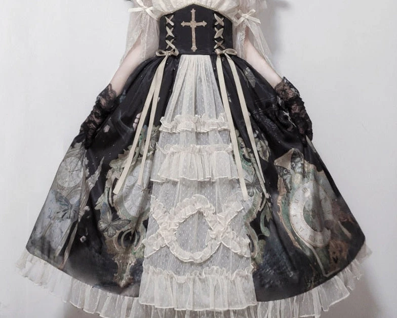 - Intricate Artwork: The skirt’s print features gothic-inspired artwork, blending vintage clocks and abstract designs for a dark, mysterious look.