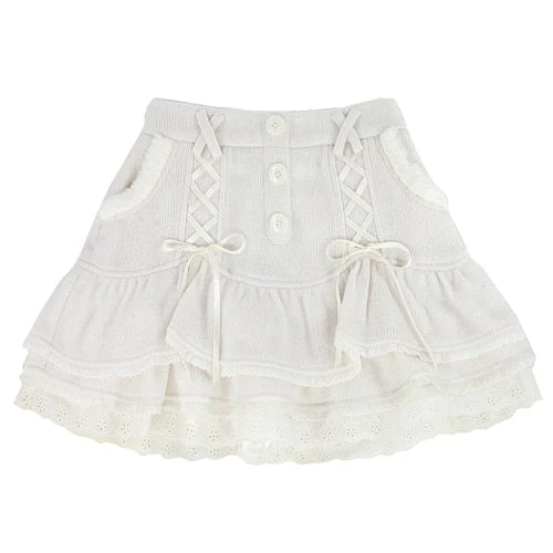 - A beautiful light pink corduroy skirt with lace corsetry, buttons, and a layered cake skirt design with beautiful doily lace trim.Â
