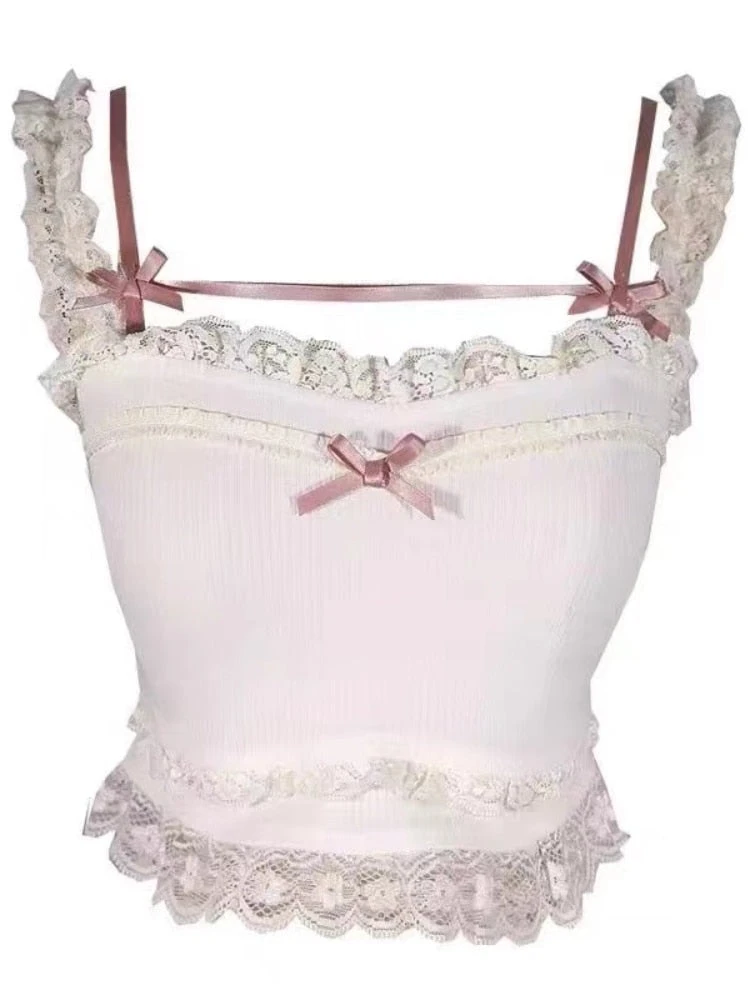 - This cotton pink tank top is made of quality knitted fabric with silky ribbons across the chest, lace spaghetti straps, bows and a stunning ruffle lace trim!