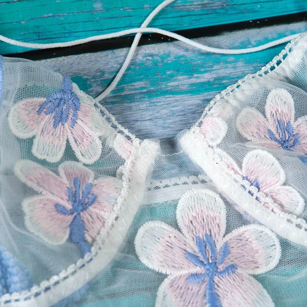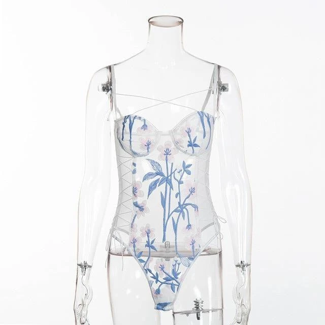 With a gorgeous criss-cross upper body harness, lace-up corsetry along the sides, and beautiful baby blue florals all over, this little one piece bodysuit is made to slay!