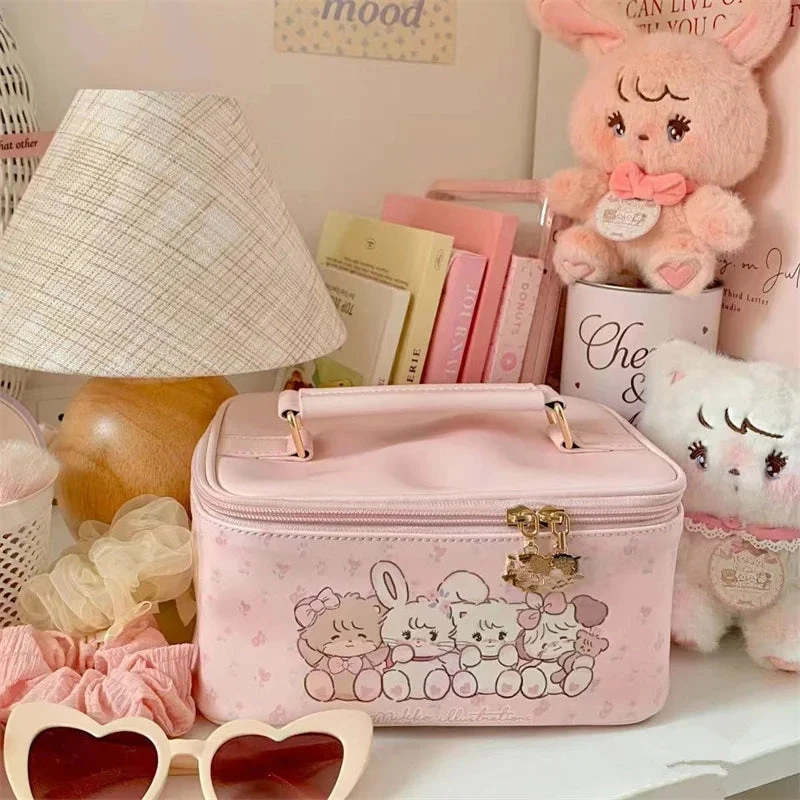 - Charming Design: The “Kawaii Friends Make-up Case” features an endearing pastel pink hue adorned with illustrations of lovable characters that evoke a sense of whimsy and girlyness.