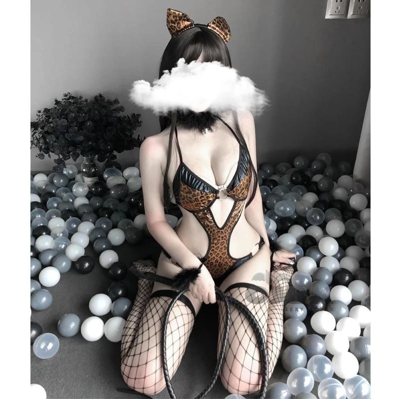 This kawaii leopard print kitten lingerie set has gorgeous hand-details including beautiful black lace trim, leopard print gloves, a full metal ring embellished bodysuit, and all the fixings for a purrrrfect kitten leopard set!Â