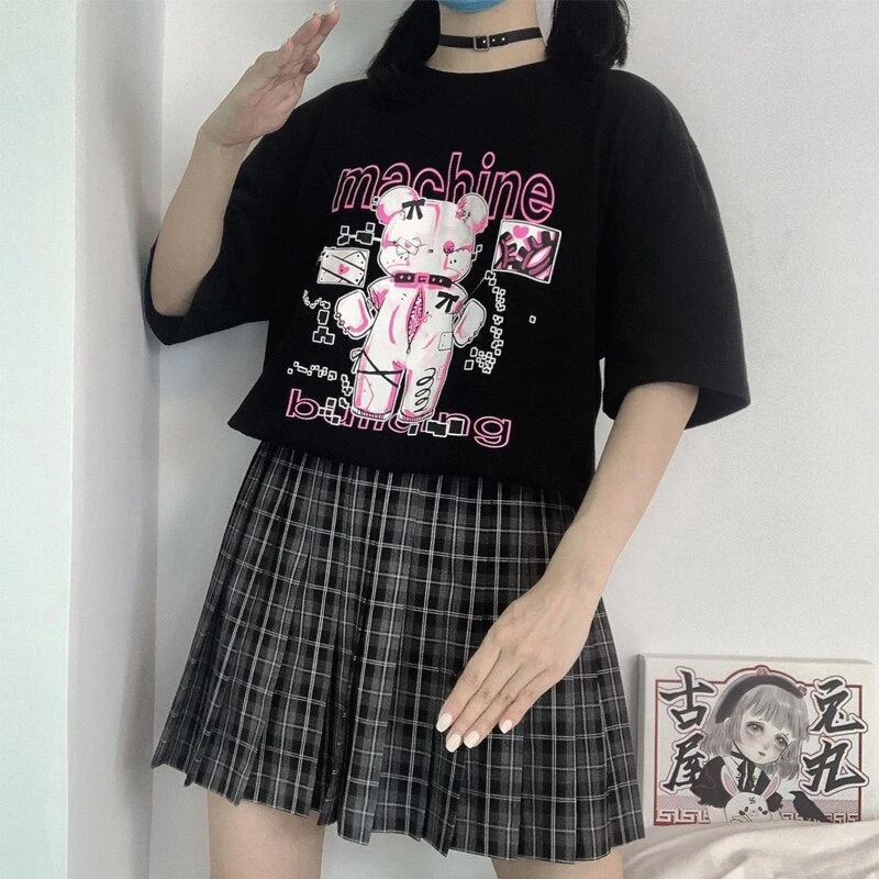 Step into the world of kawaii fashion with the Machine Bear Menhera Tee! This oversized black t-shirt is the ultimate in creepy cute style, perfect for fans of pastel goth or goth aesthetics. With its bold and edgy design, this tee showcases a unique blend of cyber-anime influences, making it a must-have for your wardrobe.