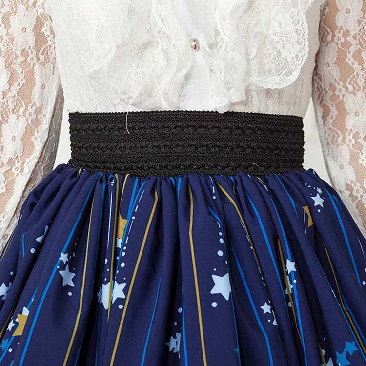 - With gorgeous ruffles, lace trim, and a vibrant midnight compass & star constellation print on dark navy blue backdrop, this skirt looks divine with or without a petticoat!Â
