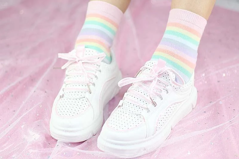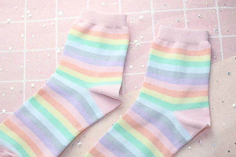 These sweet milky pastel rainbow socks are a must have for any kawaii babe who enjoys fairy kei pastel fashion!