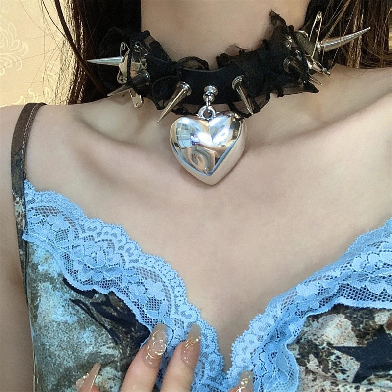 - 💖 A large silver heart dangles at its center – perfect for the romantic in you! ⚡️ Unleash your inner alt goddess with chunky silver spikes.