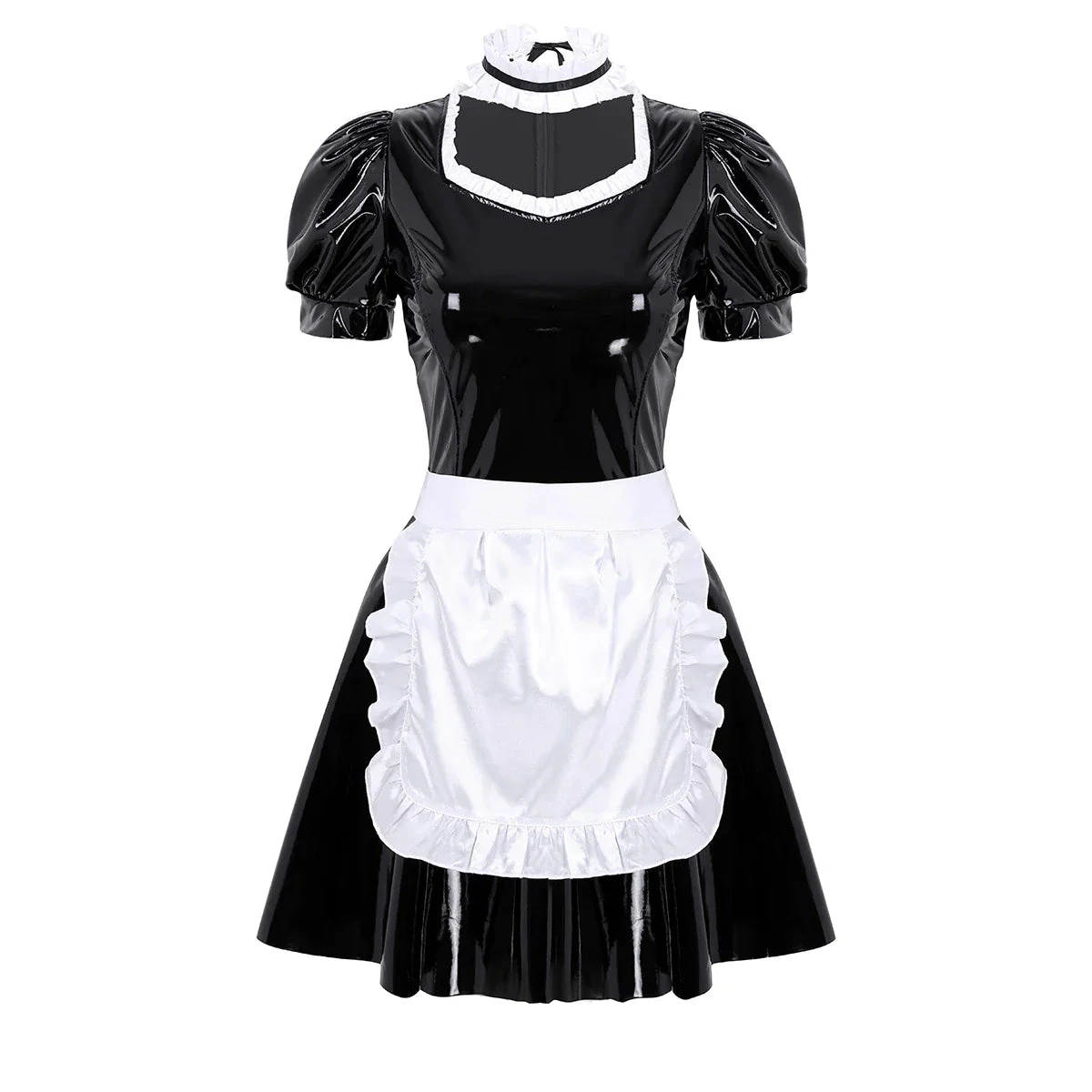 - Made of gorgeous shiny vegan wet-look fabric that’s comfortable to wear, with a saucy removable apron and girly white ruffled trim.