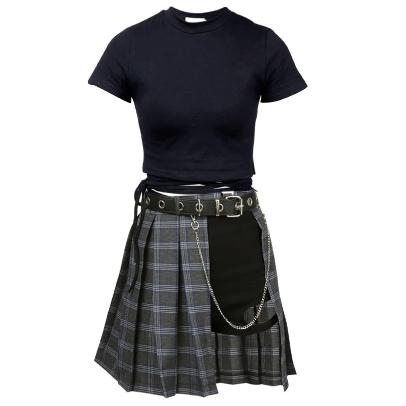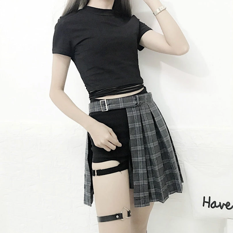- Recreate this entire look with the stomach-wrap t-shirt, black shorts, grey plaid skirt, and matching black leather belt! Or mix and match and create your own gothic look!Â