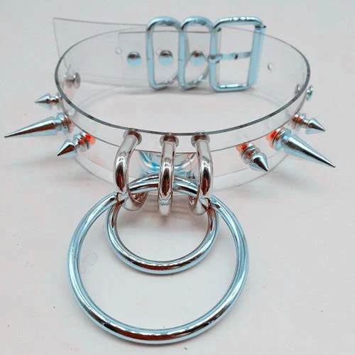 - This gothic clear collar features punk rock metal spikes in gold or silver, with 2 large O-ring hooks to attach whatever you want!