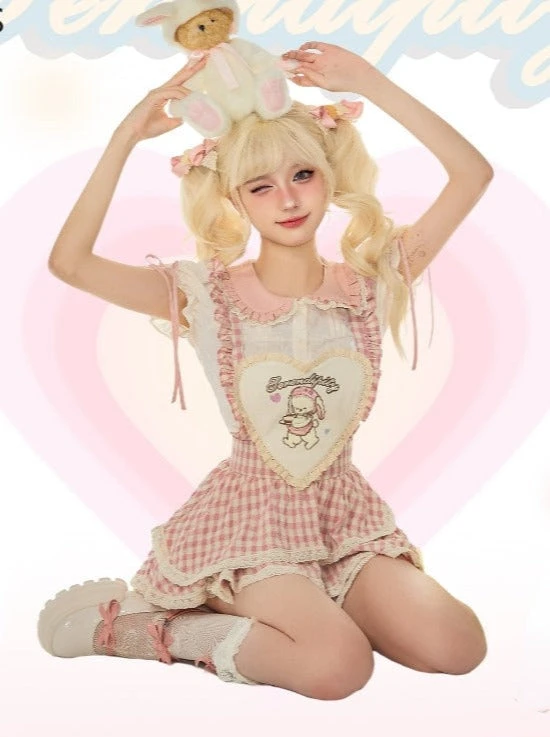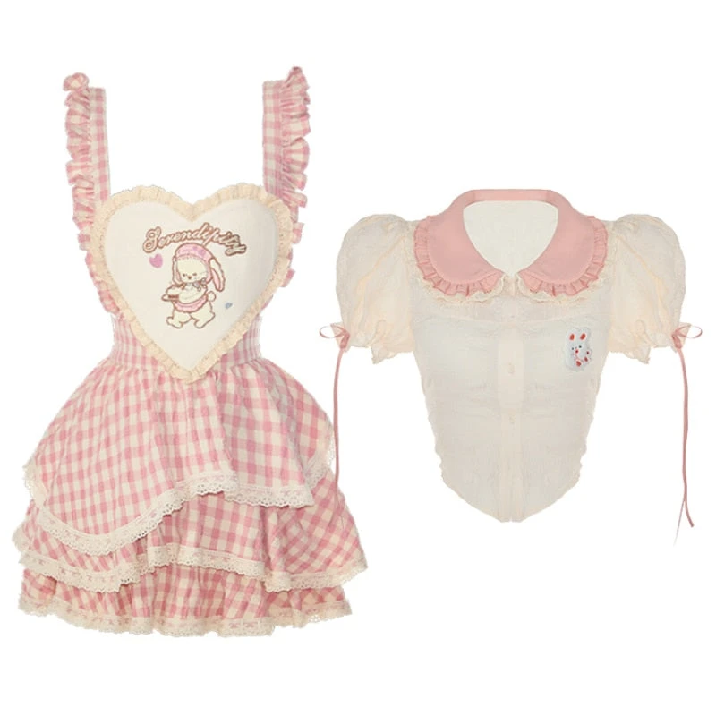 - 🐇 Heart-Shaped Suspender Dress: Fall in love with the charming heart-shaped suspender dress featuring an embroidered bunny on the front and the word “serendipity.” It’s pure whimsy and luck all in one!
