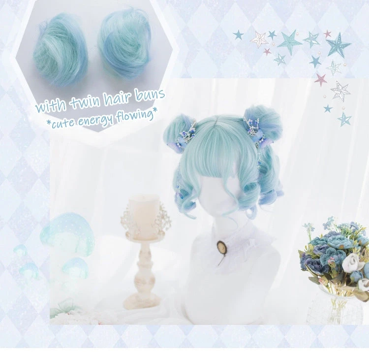 - The wig features a blue bob hairstyle with two pigtail buns on top, adding a touch of kawaii charm to the overall look.
