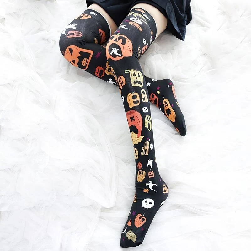 These spooky halloween inspired high quality thigh high stockings have a vibrant pumpkin print all over that stretches and holds it’s color wonderfully!