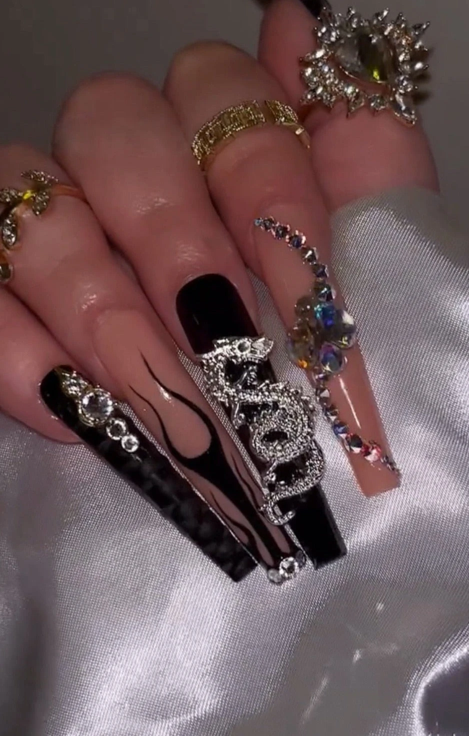 - Gothic Black Butterflies: These nails showcase an edgy black design with intricate butterfly patterns and gemstone accents, making them perfect for a bold, gothic aesthetic.