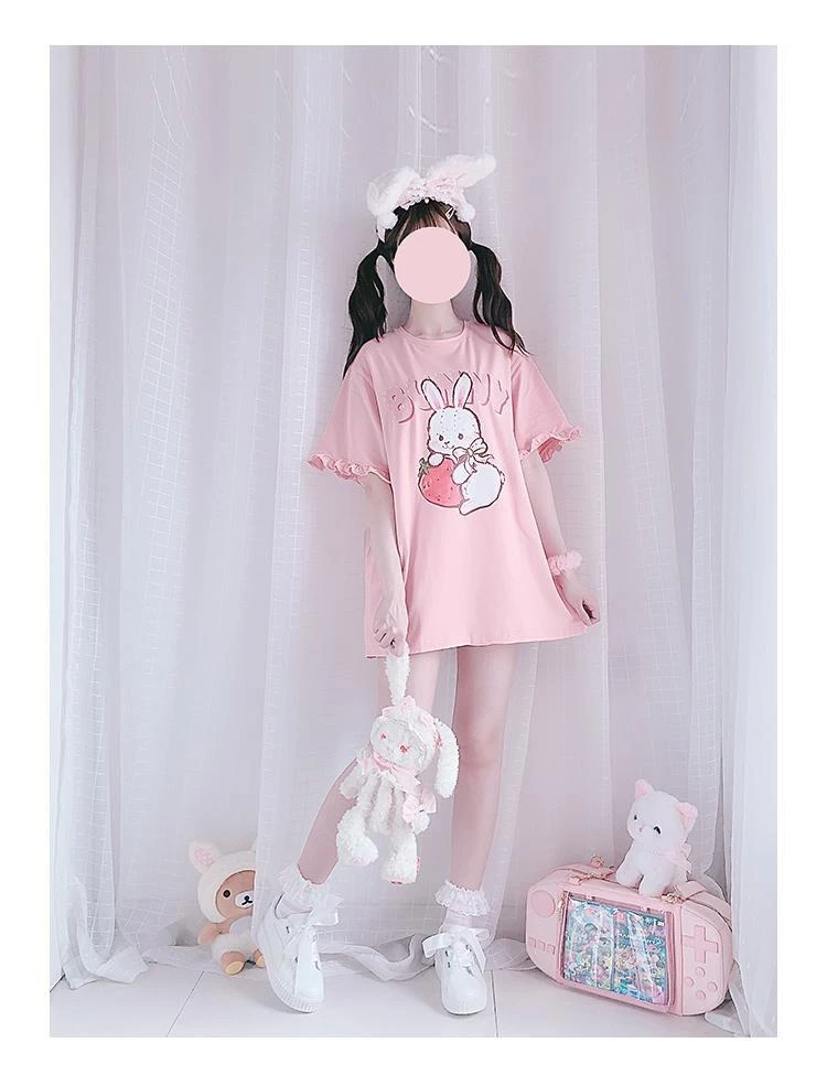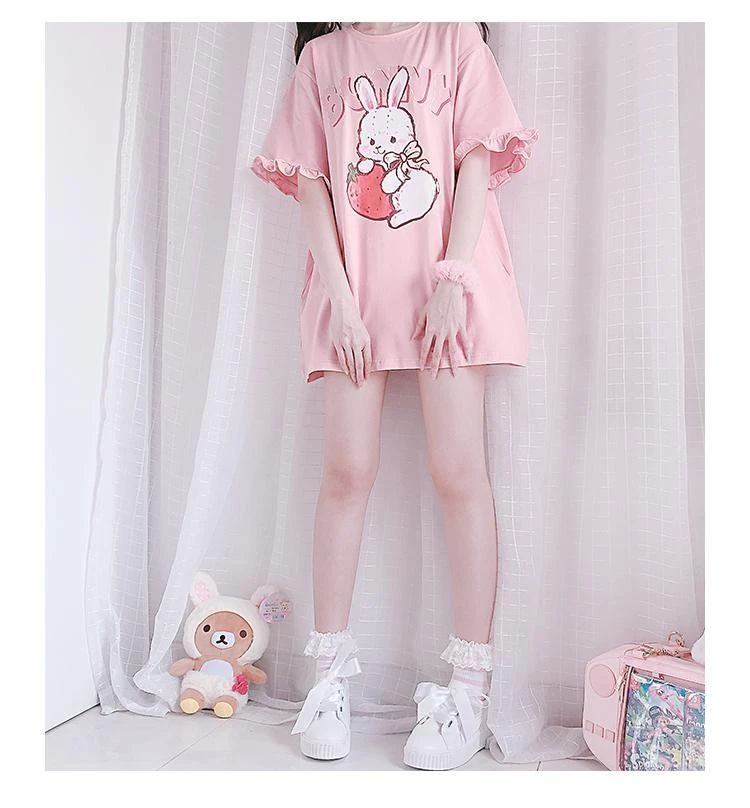 - This precious oversized strawberry bunny tee has so many girly details, you’ll want to live in this sweet pink top!