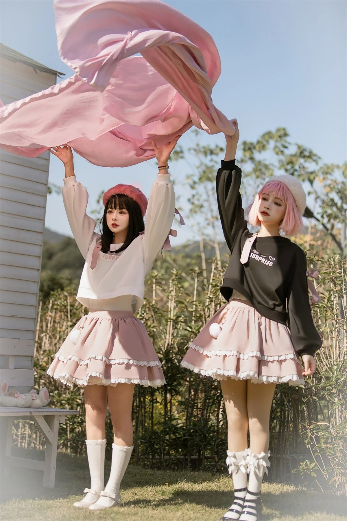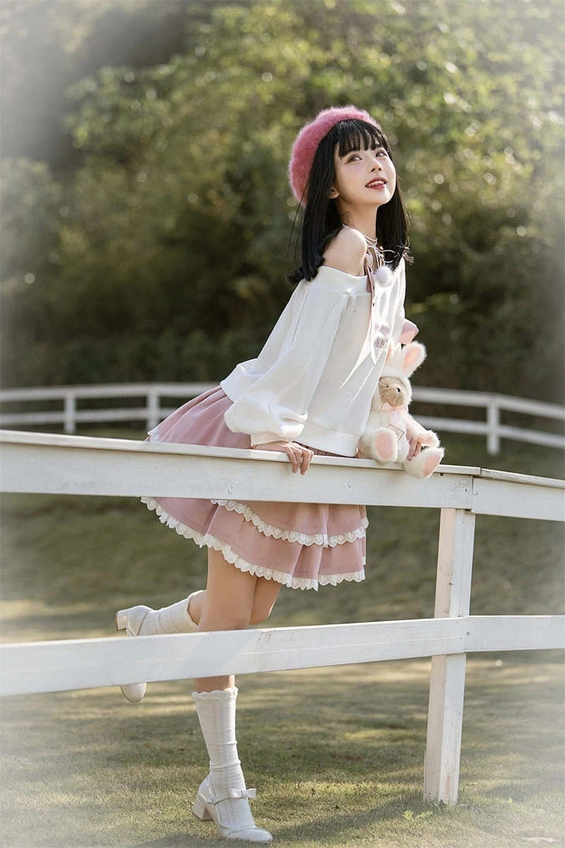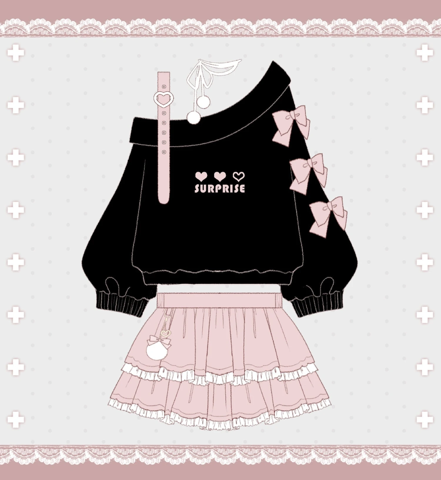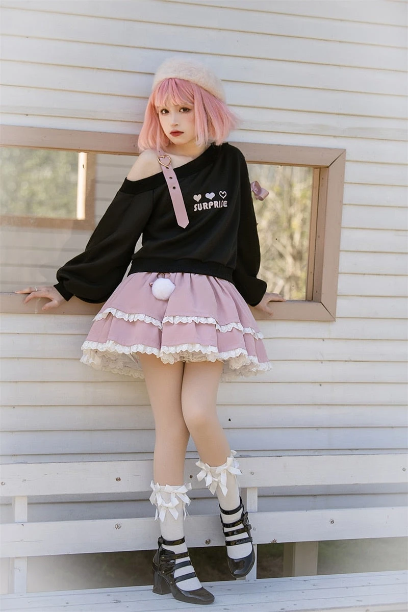 - Piece this cute pastel gothic outfit together one by one with a cute heart surprise off the shoulder belted top, then pair it with a matching cake layered skirt.