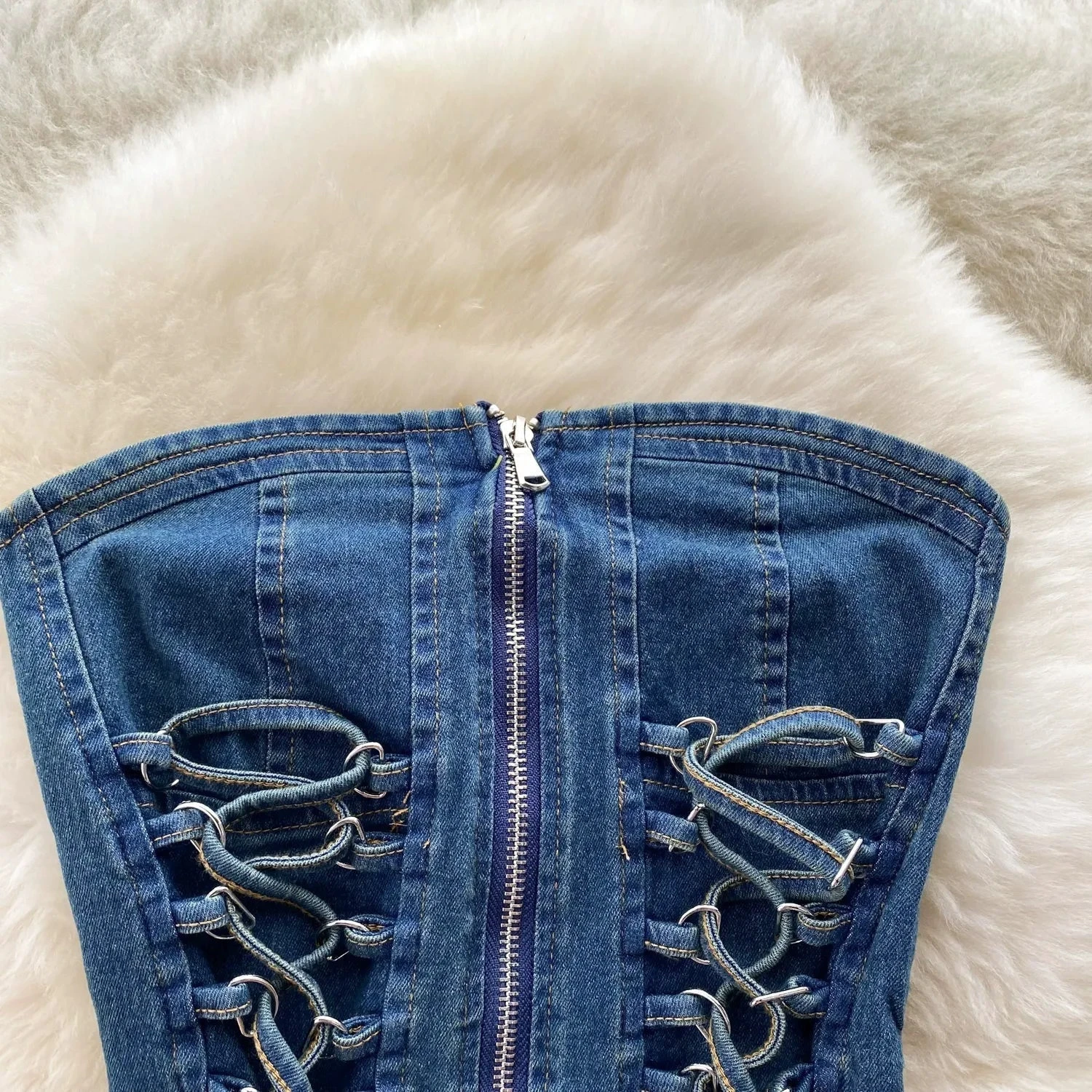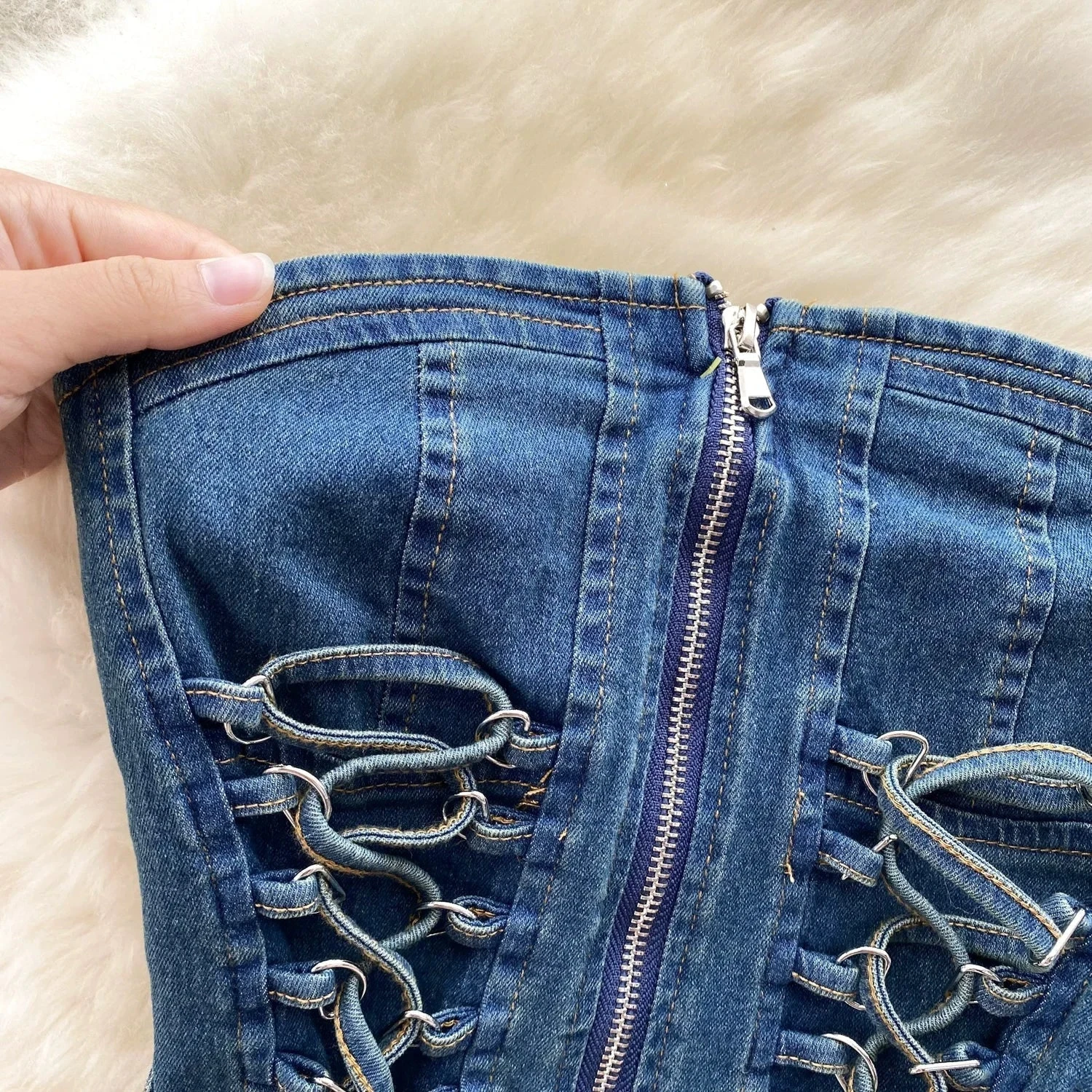 - Corset-Style Top: The denim corset top has lace-up detailing on both sides with a front zipper closure, blending a structured fit with a touch of edgy style.