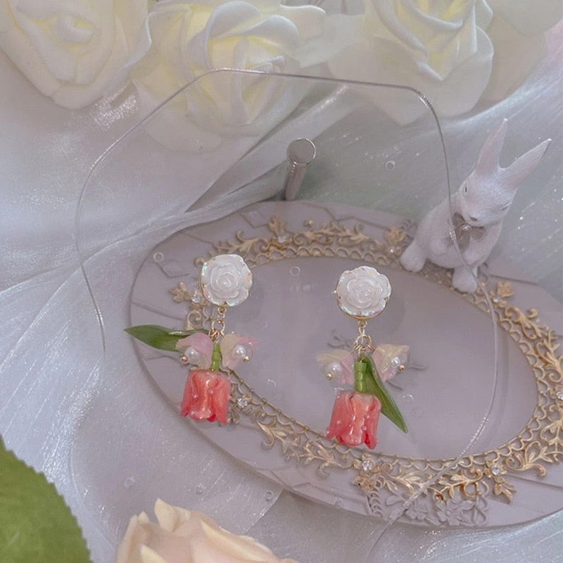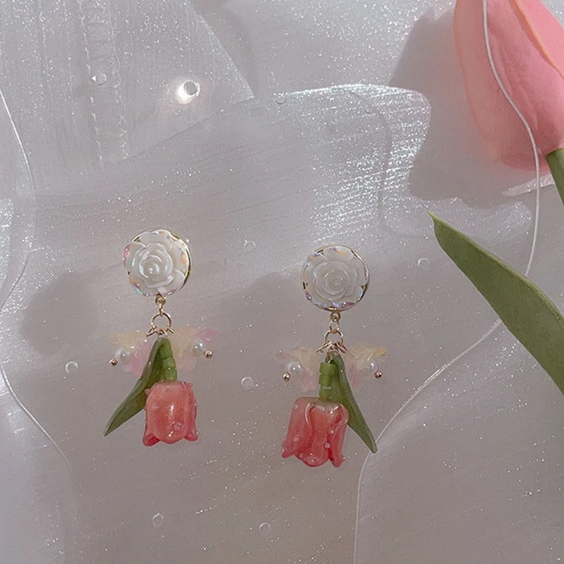 - These dainty and angelic dangly tulip flowers earrings are perfect for cuties who love all things soft, pastel, and fairy-like.Â